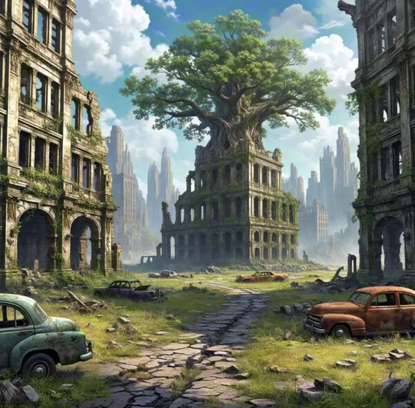 In these ruins, the wilderness and nature begin to revive. Wild grasses crawl up skyscrapers, vines entwine abandoned buildings, and forests find space to grow in the cracks of the city. On the deserted streets, the wind blows dust, and fallen leaves scatter as if nature is conversing with the once-glorious civilization. Each painting serves as a testament to the passage of time, recording humanity’s rise and fall between prosperity and decline, illustrating how nature gradually consumes human relics and ultimately restores balance in its own way.
