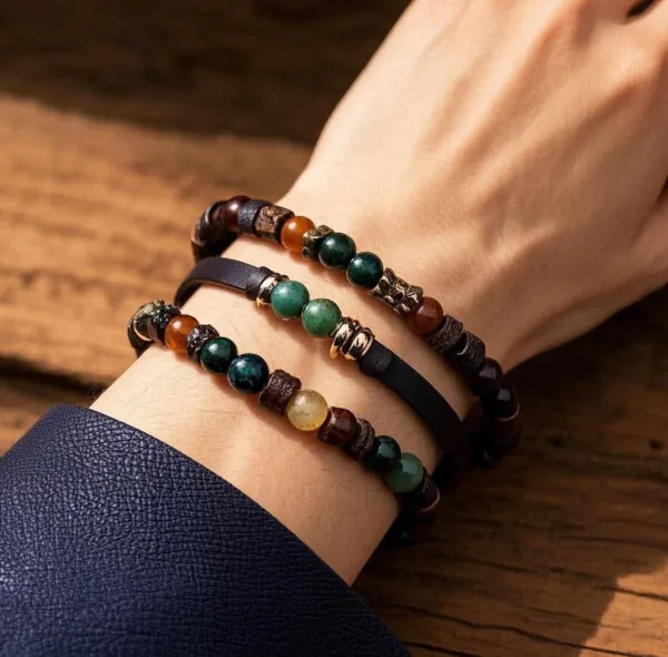 The “Lost Forest” custom leather bracelet is inspired by the natural textures of the forest, crafted from premium leather and natural gemstones. The natural leather patterns and gemstone luster complement each other, evoking the mystery and tranquility of the forest. With customizable options, each bracelet is a unique piece that reflects personal style while connecting you to nature.