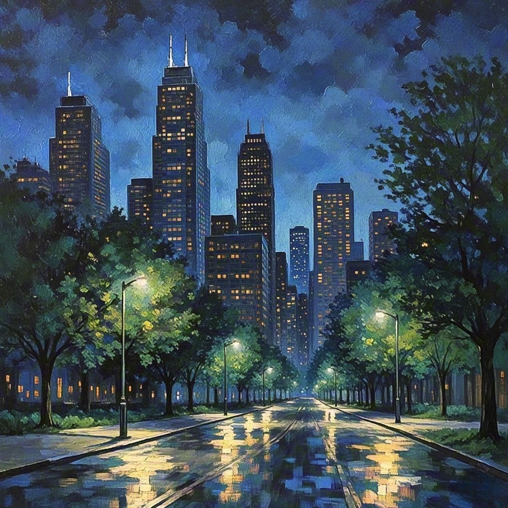 Each painting in this series is a reflection of different nocturnal landscapes. The towering city skyscrapers stand cold and modern under the blue light, the starry sky of a quiet countryside twinkles softly, and the waves gently kiss the shoreline, like an unspoken whisper. The deep blue hue wraps everything, creating a world that belongs solely to midnight, calm, distant, and mysterious.