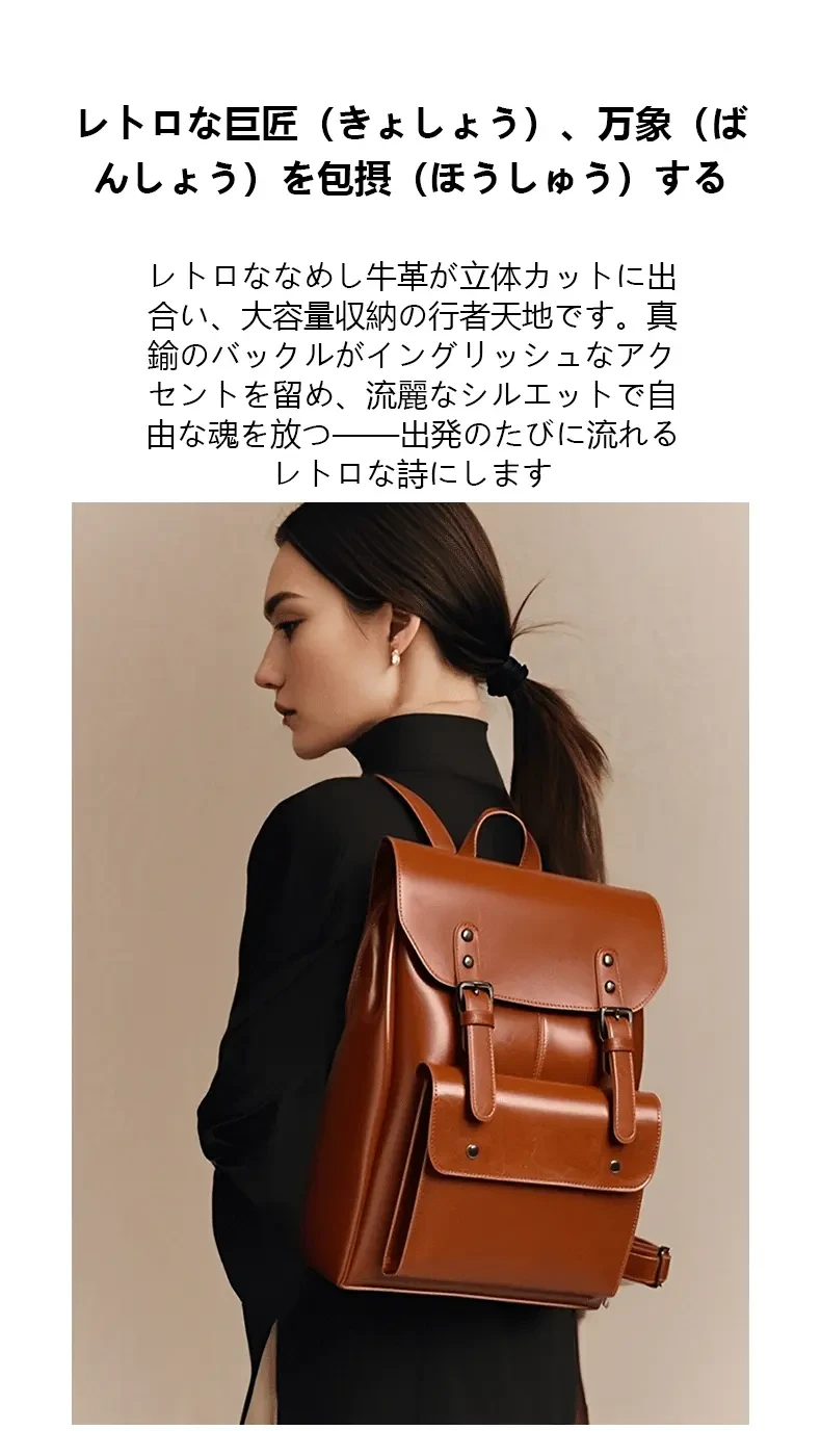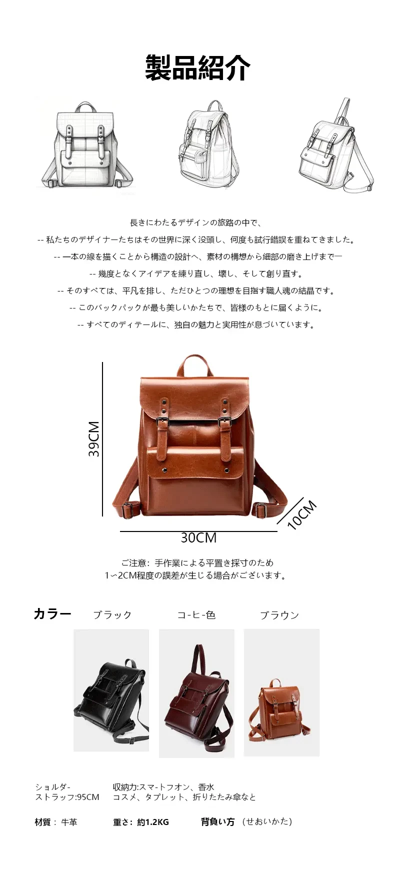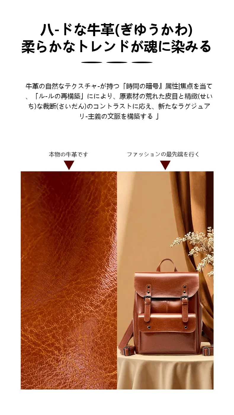 厳選されたフルグレインレザーを使用し、職人が一つひとつ手作業で仕上げました。スタイリッシュなデザインと実用性を兼ね備え、3色展開で様々なライフスタイルに対応。通勤、旅行、日常使いに最適な、上質なレザーバックパックです。