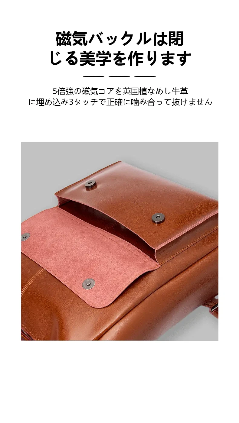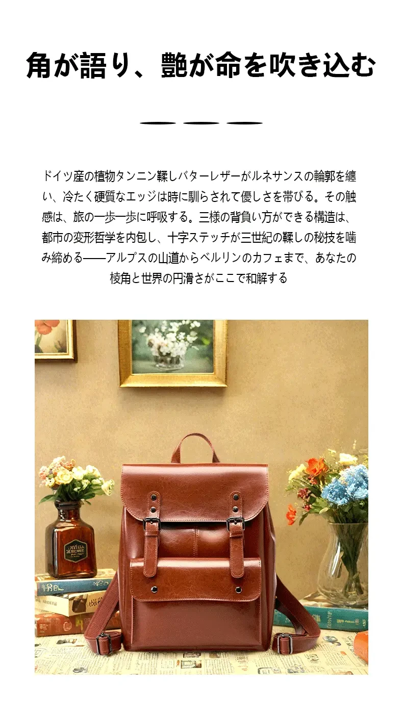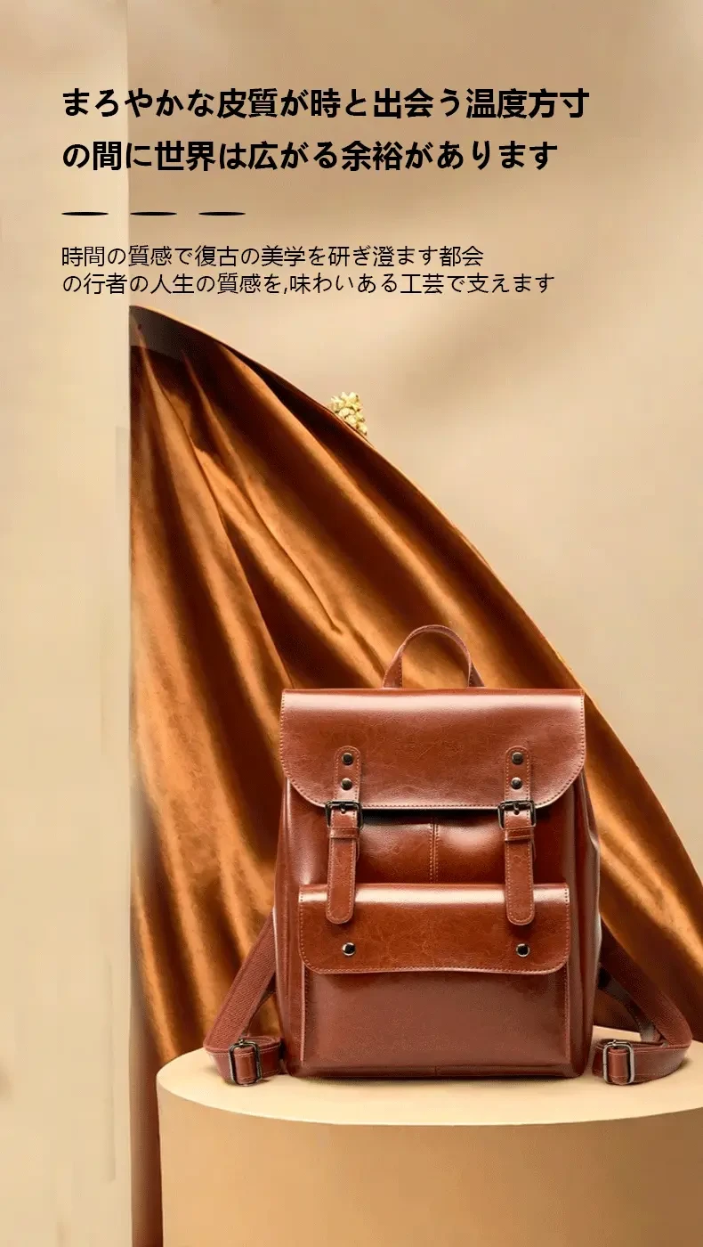 厳選されたフルグレインレザーを使用し、職人が一つひとつ手作業で仕上げました。スタイリッシュなデザインと実用性を兼ね備え、3色展開で様々なライフスタイルに対応。通勤、旅行、日常使いに最適な、上質なレザーバックパックです。