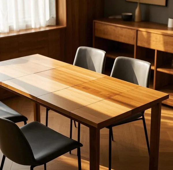 Another key feature is the eco-friendly materials used in this dining table. We’ve selected premium, environmentally conscious bamboo and wood, ensuring each table meets eco-friendly standards while remaining durable for years. The unique grain of the natural wood and the texture of the bamboo add a distinctive touch to each table, ensuring it’s not only visually appealing but also long-lasting and stable. Bamboo’s inclusion not only enhances the table’s eco-friendliness but also adds a soft, inviting feel that’s perfect for family use.