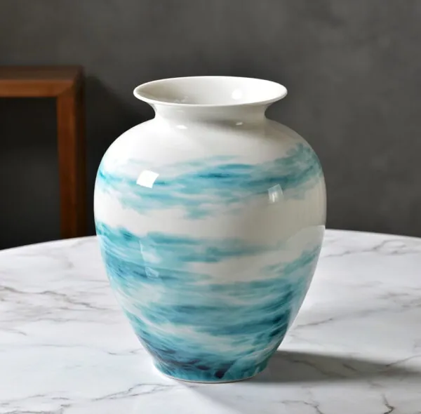 Each “Fleeting Light” vase is meticulously handcrafted by skilled artisans, using high-quality porcelain and fired at high temperatures. The surface of the vase is hand-painted with delicate wave patterns or light effects that seem to ripple across the surface, as if a gentle breeze has passed over the water, creating a shimmering dance of light. These subtle patterns evoke the fleeting beauty of nature, adding endless visual enjoyment and emotional resonance.