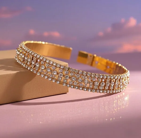 The design of “Radiant Dawn” is inspired by the regal elegance of vintage aristocracy and the precision of modern diamond-setting techniques. Each diamond is delicately placed, creating an interplay of light and shadow that adds depth and sophistication to the piece. This headband is not just an accessory but a symbol of feminine grace and luxury. The design is both minimalist and grand, with the shimmering diamonds complementing the elegant lines, making it an exquisite addition to any outfit.