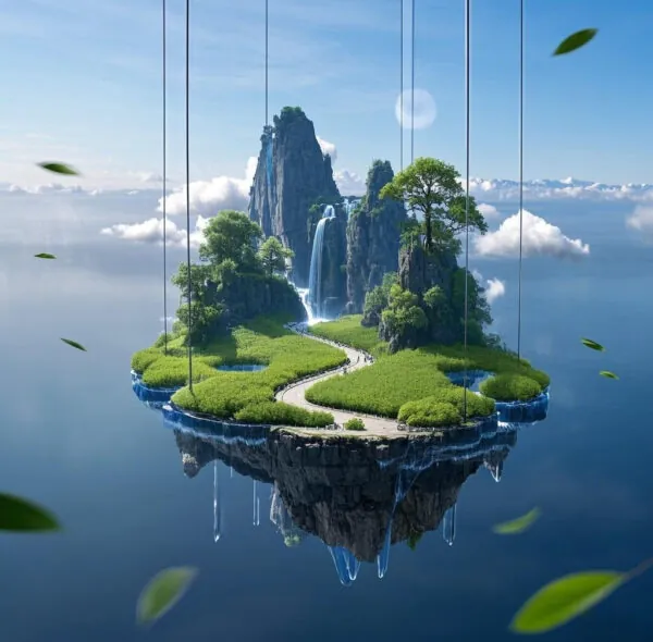Island in the Sky is not merely an artistic reproduction of natural landscapes; it also explores the fusion of nature and human technology. These floating islands symbolize humanity’s exploration of the unknown and our reverence for nature, while also presenting a beautiful vision of a sci-fi world where technology and nature coexist harmoniously. The levitation of the islands is not only a physical phenomenon but also a philosophical “transcendence,” symbolizing humanity’s breakthrough of traditional understanding and our courage to explore unknown territories.