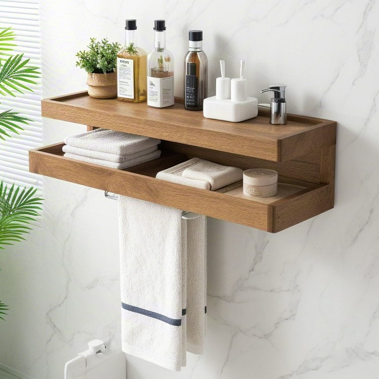 Due to the humid bathroom environment, the wood surface is specially treated to ensure strong waterproof performance. Even with prolonged use, it won’t warp or get damaged by moisture. The shelf is durable and suitable for long-term use, and its surface is easy to clean and maintain—simply wipe it regularly to preserve its original shine and beauty.